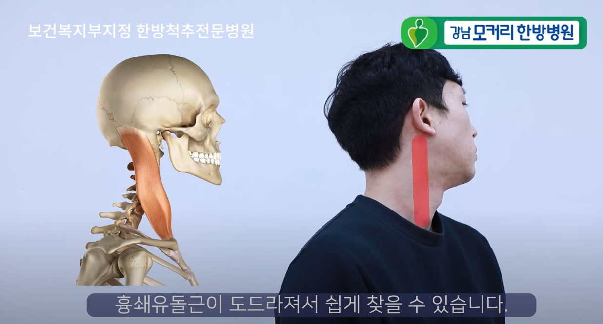 흉쇄유돌근을 쉽게 찾는 법은 숨을 가슴으로 크게 들이 마시면서 어깨를 살짝 들어올리면 흉쇄유돌근이 도드라져서 쉽게 찾을 수 있습니다. 흉쇄유돌근은 귀 뒤쪽에서 쇄골쪽으로 연결되는 근육이기 때문에 쇄골 바로 위에서 쉽게 만질 수 있습니다.