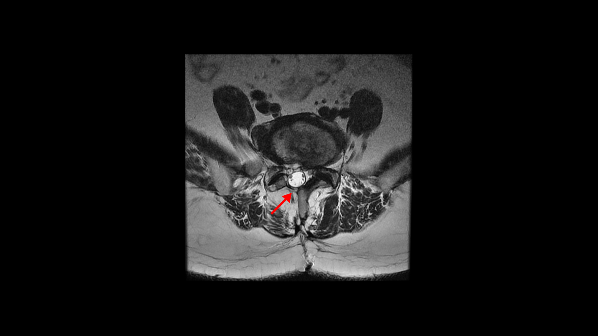 이 환자분은 허리수술을 여러 번 한 상태에서 결국에는 척추유합술까지 하셨습니다. MRI를 보시면 5번 1번 후궁에 수술한 자국이 보입니다.
