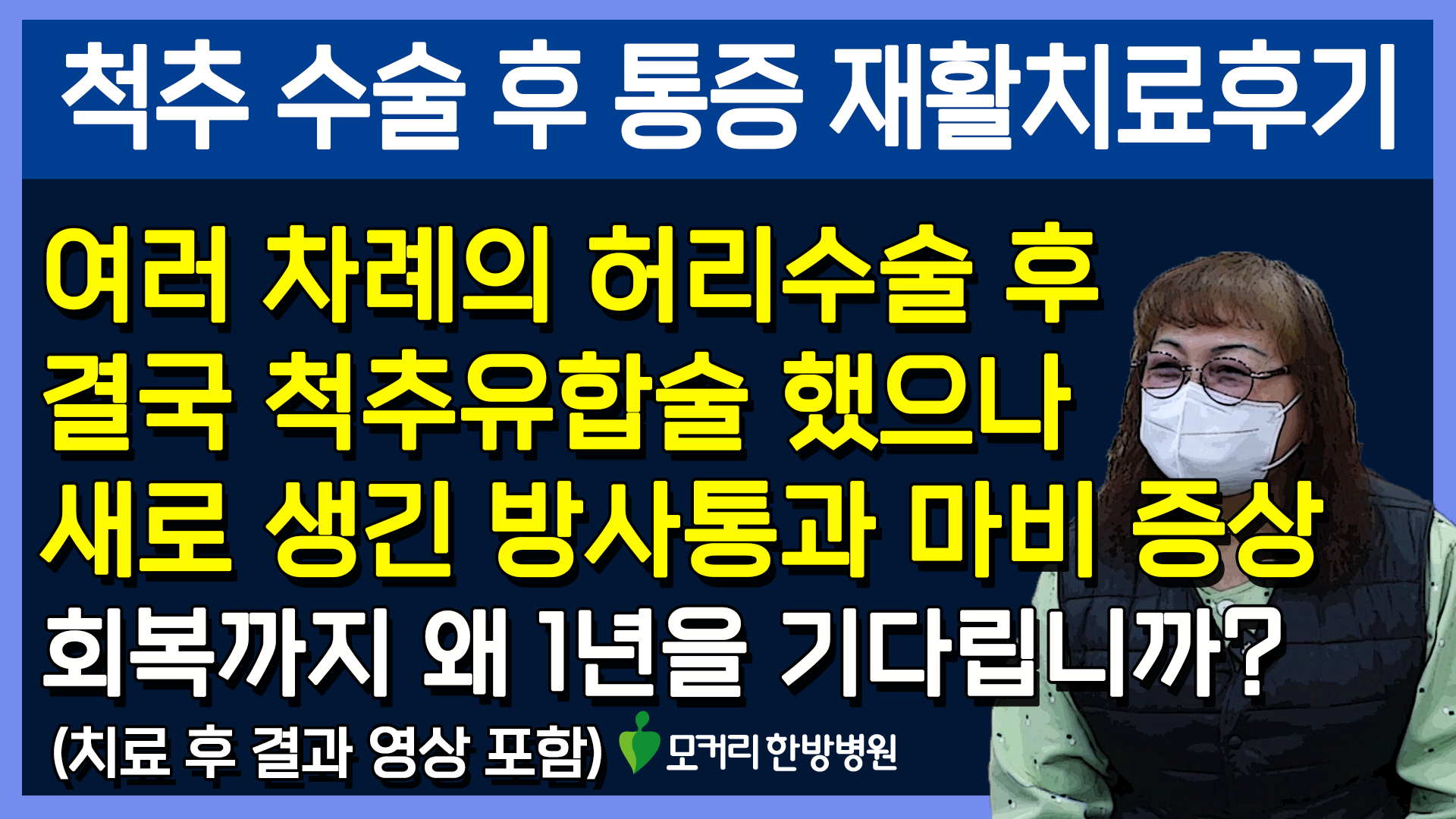모커리한방병원은 디스크, 협착증, 전방전위증 등으로 오랫동안 다리 방사통을 겪은 환자분들 중 수술 받은 분들께 수술 후 남아있거나 새로 생기는 방사통이나 마비 증상은 회복을 위해 1년씩 혹은 그 이상 오래 기다릴 필요가 없다고 설명 드립니다. 보통은 수술집도의 분들의 설명은 수술 전에 오래 눌려있던 신경이 다시 회복되는데 시간이 오래 걸리기 때문에 기다려야 한다고 얘기하는데, 저희 관점에서는 척추 수술 후 회복되는데 시간이 오래 걸리는 이유가 전혀 다릅니다.