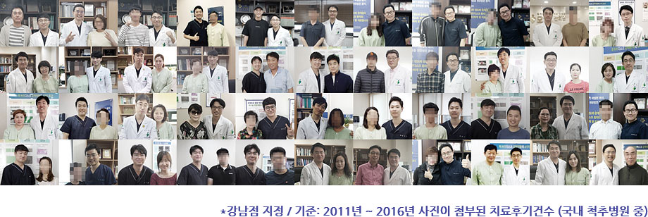 *강남점 인증 기준: 2011년~2016년 사진이 첨부된 치료후기건수 (국내전체 척추병원 중)