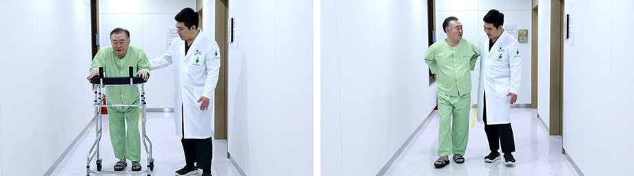 이 같은 치료가 끝나고, 병실에 올라오면 약간의 휴식 후 병동 전담 한의사와 함께 걷기운동 교육을 받습니다. 입원 초에는 걷는 것이 굉장히 힘들기 때문에 보행기의 도움을 받아 걷기 운동을 합니다. 치료를 진행하면서 증상이 호전되어 걸어지기 편해지면 보행기 없이 걷는 시간을 점점 늘려가면서 연습을 하게 됩니다. 걷기 운동은 허리에 힘이 들어가지 않으면서도 퇴행으로 인해 긴장되고 뭉친 근육을 풀어주어 척추관협착증 환자에게 가장 좋은 운동입니다. 걷기 운동은 퇴원 이후에 지속적으로 치료 효과를 유지하는데 굉장히 중요한 운동이기 때문에 입원기간 내내 걷기 운동을 충분히 교육시켜서 퇴원 이후에도 집에서 잘 할 수 있도록 도움을 드리고 있습니다.