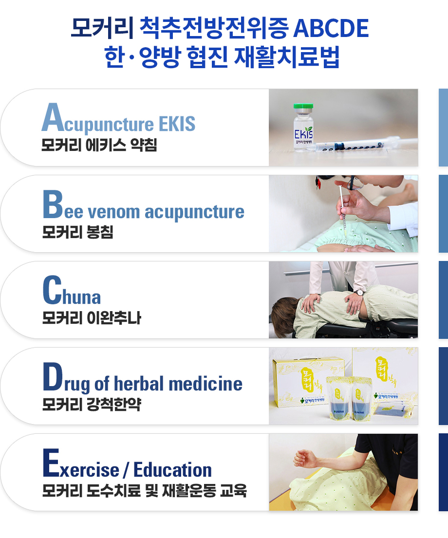 모커리 척추전방전위증 ABCDE 한·양방 협진 재활치료법은 수술 없이 전방전위증을 치료하는 모커리 고유의 비수술 치료방법입니다. 척추전방전위증은 통증을 일으키는 원인인 디스크나 협착증 증상을 치료하는 것이 핵심인 만큼 모커리에서는 정확한 원인을 찾아 통증을 제거하는 비수술 치료를 진행하고 있으며, 유합술을 권유 받은 뼈가 2단계 이상 밀려나간 척추전방전위증도 ABCDE 치료법으로 수술 없이 치료할 수 있다는 것을 연구하여 학술지 등에 발표하고 있습니다.