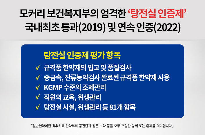 보건복지부의 엄격한 원외탕전실 인증제(일반한약)는 제대로 된 약재가 들어오는지, 한약재의 중금속 및 잔류농약 검사 등의 안전성 검사가 이루어졌는지, KGMP 수준의 꼼꼼한 조제가 이루어지는지, 위생적인 시설에서 조제되는지 등을 포함한 81개 항목이 평가를 받았습니다.
