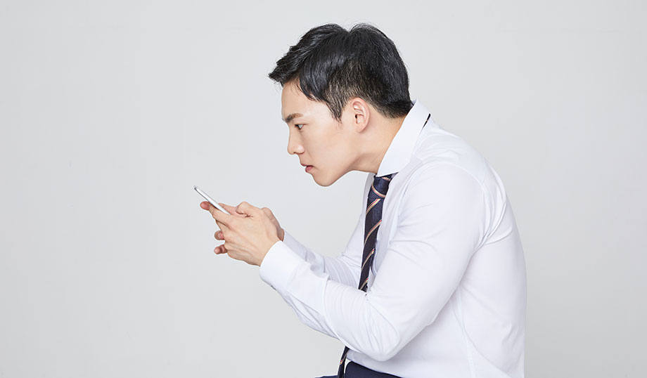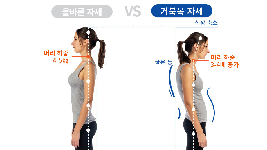 올바른 자세로 있을 경우 보통 4~5kg 정도의 하중이 정상목에 가해지게 됩니다. 그러나 거북목 자세와 같이 고개를 앞으로 숙일 경우 앞으로 숙이면 숙일수록 3~4배 이상의 하중이 증가하게 됩니다. 그 결과 목에 많은 부담이 가서 거북목으로 변형이 될 가능성이 높아지며 목통증이 발생할 수 있습니다.