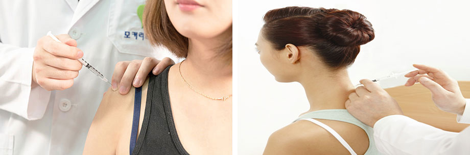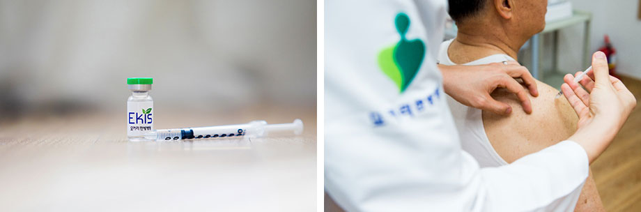 에키스약침은 염증 및 부종제거, 연골보호, 뼈 파괴세포 억제, 신경기능 회복 등의 효과가 객관적으로 검증된 한약을 정제한 약침액으로, 통증 부위 경혈에 직접 주입하여 통증을 감소시켜줍니다. 퇴행되고 약해진 어깨 주변 근육과 인대의 기능을 강화하는데 효과적인 에키스약침은 오직 모커리에서만 받을 수 있는 분당한의원 고유의 치료법입니다.