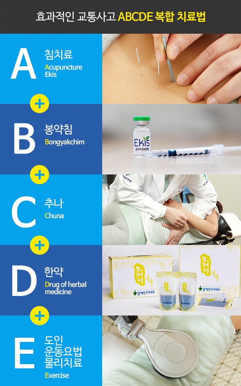ABCDE 복합 교통사고 치료법이란 침(Acupuncture)+봉약침(Bongyakchim)+추나(Chuna)+한약(Drug)+도인(운동)요법 및 물리치료(Exercise)을 통합하여 진행하는 치료법을 의미합니다. 이러한 ABCDE 복합 교통사고 치료법은 교통사고 허리통증 치료에 효능이 있는 여러 치료를 복합적으로 동시에 진행함으로써 치료 효과를 배가시킬 수 있습니다.