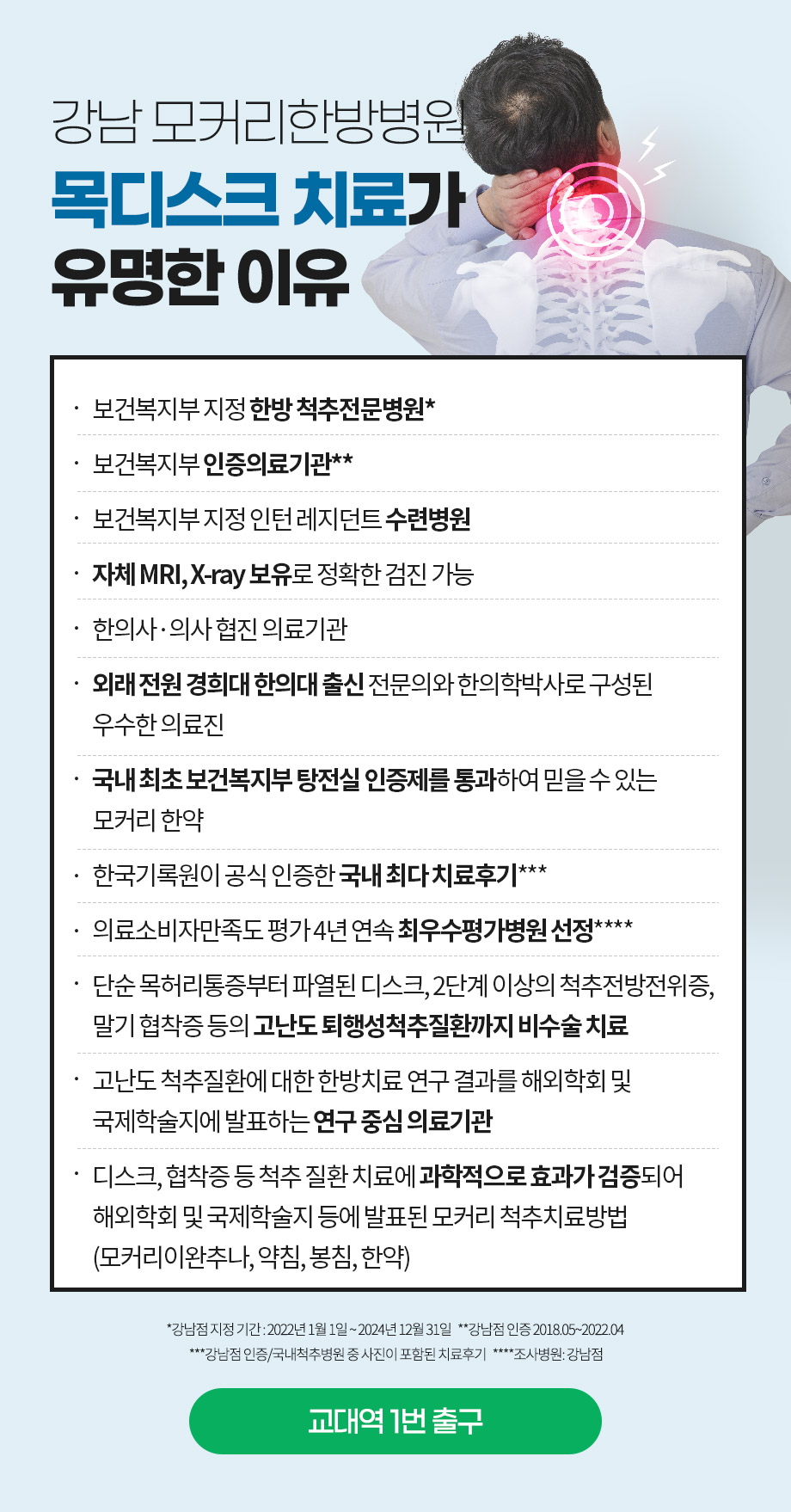 강남 모커리한방병원에서는 한 두 달의 치료 기간 내에 환자의 생활관리법이나 운동법을 자세하게 지도하여, 목디스크가 악화되지 않고 잘 회복될 수 있도록 돕습니다.