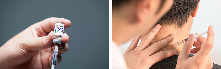 굳고 긴장된 목 주변 근육과 인대에 침을 놓아 자극을 줌으로써 뭉친 근육을 풀어주고 혈액순환을 활발하게 만들어 통증을 감소시켜주며, 근육과 인대를 유연하게 만들어 줍니다. 또한 특허 받은 한약을 정제한 약침액을 통증을 일으키는 경혈에 직접 주입해 염증 및 통증을 감소시키고, 손상된 근육과 인대의 기능 회복 및 강화에 도움을 줍니다.
