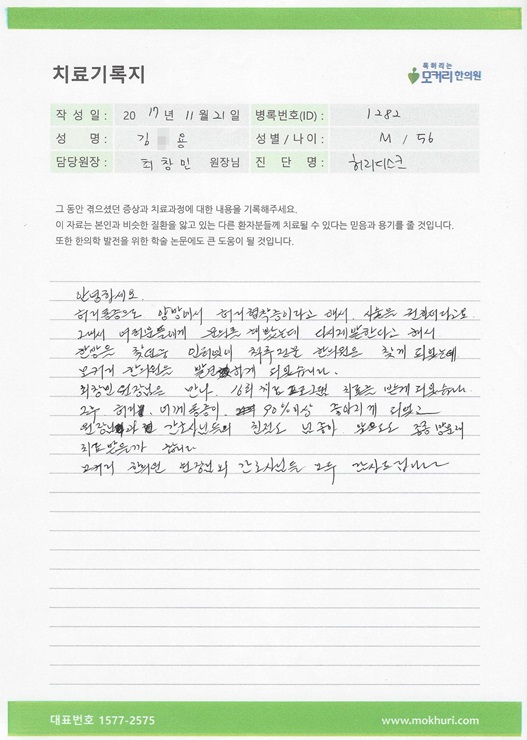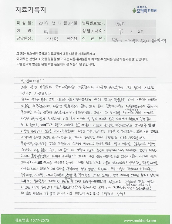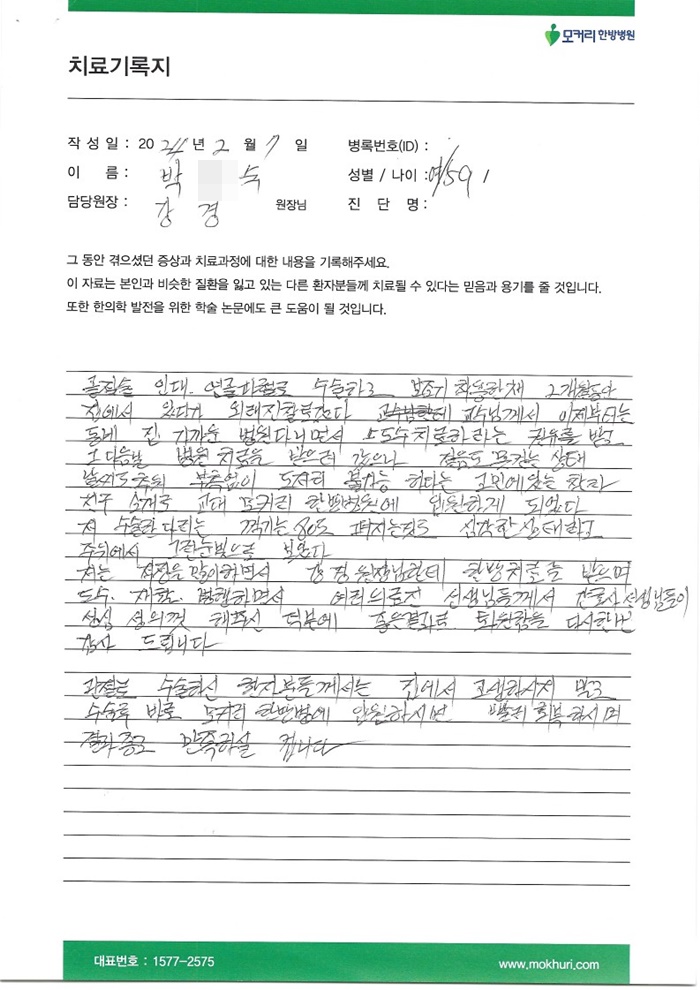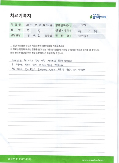 허리통증으로 양방에서 허리협착증이라고 해서 시술을 권하더라고요. 그래서 여러분들에게 문의를 해봤는데 다시 재발한다고 해서 한방을 찾던 중 인터넷에 척추 전문 한의원을 찾게 되었는데 모커리한의원을 발견하게 되었습니다.