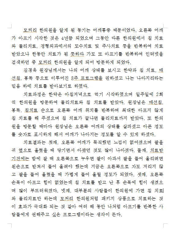 오른쪽 어깨가 아프기 시작한 것은 4년쯤 되었으며 그동안 다른 한의원에서 침 치료와 물리치료, 정형외과에서의 도수치료 및 주사치료 등을 반복하여 치료받았으나 한동안 치료가 된 듯하다 가도 또 아프기를 반복하여 인터넷을 검색하던 중 모커리 한의원을 알게 되어 방문하게 되었다.