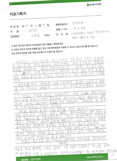 처음 증상은 '17년 12월 말 목과 어깨가 뻐근하고 고개가 잘 돌아가지 않는 것으로 시작되었습니다. 직장 관계로 동네 한의원과 정형외과 치료를 받았지만 증상은 악화되었습니다. 그렇게 한달이 지난 '18.01.20에는 왼쪽 팔이 당기고, 저리며 밤에 잠을 자지 못할 정도로 통증을 동반한 저림과 담김증상이...