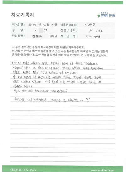 2017.6.29 교통사고가 난 후 일반병원에 한달간 입원하였습니다. 퇴원 후 지인의 소개로 모커리한의원(미금)에 내원하여 최재호 원장님께 5개월간 치료를 받았습니다.