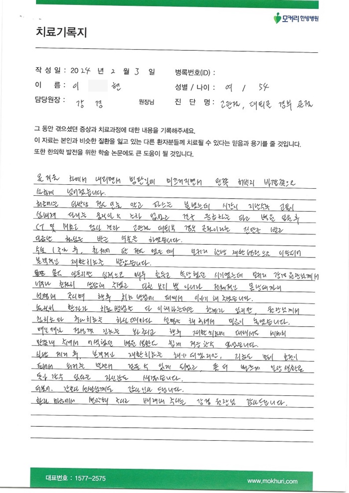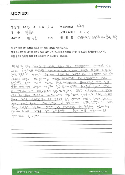몇 년 전 부터 허리와 목 디스크로 통증이 심해 양방병원에서 신경 차단술 시술도 해보고 입원 치료도 받았지만 얼마 지나지 않아 또 다시 재발된 통증으로 진통제와 복대를 착용하며 지내던 중 회사에서 힘들어 하는 제 모습을 보고 다른 부서에 있는 분이 허리디스크 파열로 양방병원에서는 다 수술을 권유하였는데...