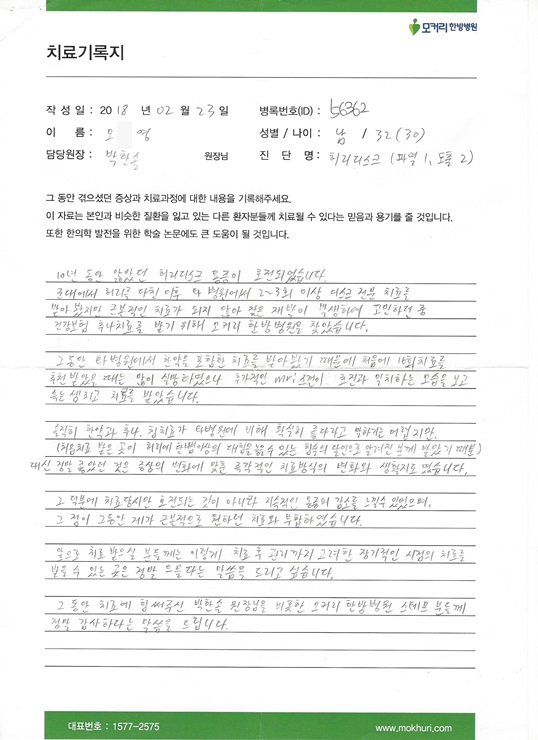 10년동안 앓았던 허리디스크 통증. 군대에서 허리를 다친 이후 타 병원에서 2~3회 이상 디스크 전문 치료를 받아봤지만 근본적인 치료가 되지 않아 잦은 재발이 발생하여 고민하던 중 모커리한방병원을 찾았습니다.