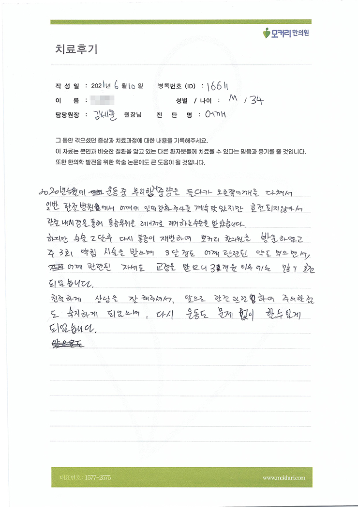 카티스템(줄기세포 이식술)과 근위경골절골술을 받은 후에 수술만큼이나 중요한 재활을 어떻게 받아야 하나 걱정하던 중에 지인의 조언을 듣고 모커리한방병원을 선택해서 재활치료를 받았습니다.