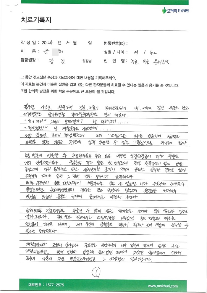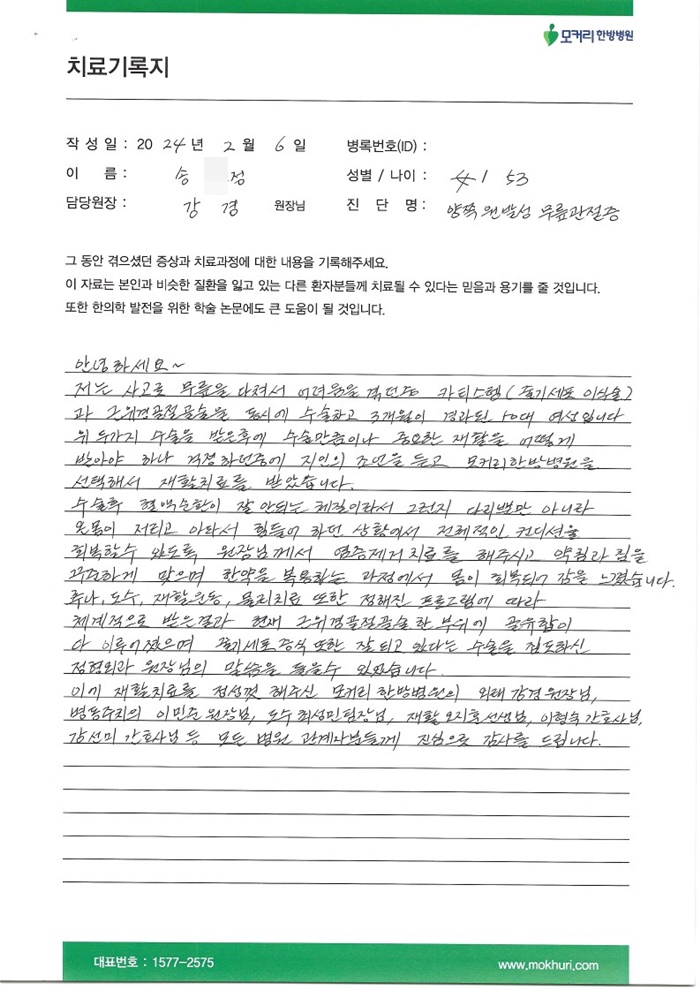 인대, 연골파열로 골절술 후 모커리한방병원에서 한방치료와 도수, 재활치료를 받았습니다.