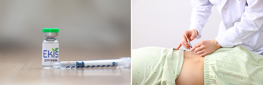 에키스약침은 파골세포 분화 억제용 또는 연골세포 분화 촉진용 조성물(SG-Ⅱ)로 특허*를 받은 강척한약을 정제한 약침액을 척추관협착증 통증 부위의 경혈에 직접 주입하는 방법입니다. 척추관협착증 환자는 퇴행성 변화로 인해 근육과 인대가 딱딱하게 굳어 있고 약해져 있습니다. 에키스약침은 퇴행으로 인해 약해진 근육과 인대의 기능 회복 및 강화하고 염증 및 통증을 감소시켜 줍니다. 또한 척추관이 좁아져 나타나는 신경 손상의 진행을 막고 손상된 신경의 재생을 촉진시켜 줍니다.