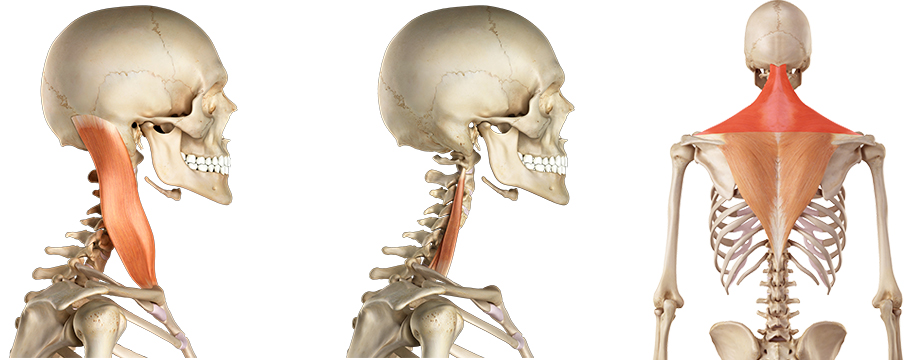 그렇다면 목디스크의 압력을 높이는 이런 목 주변 근육들은 어떤 것들이 있을까요. 먼저 목 앞쪽에서 잡아 당기는 근육으로는 흉쇄유돌근과 사각근이 있고, 목 뒤쪽에서 뭉치고 단축되어 아픈 대표적인 근육으로는 견갑거근, 승모근, 경판상근 등이 있습니다.