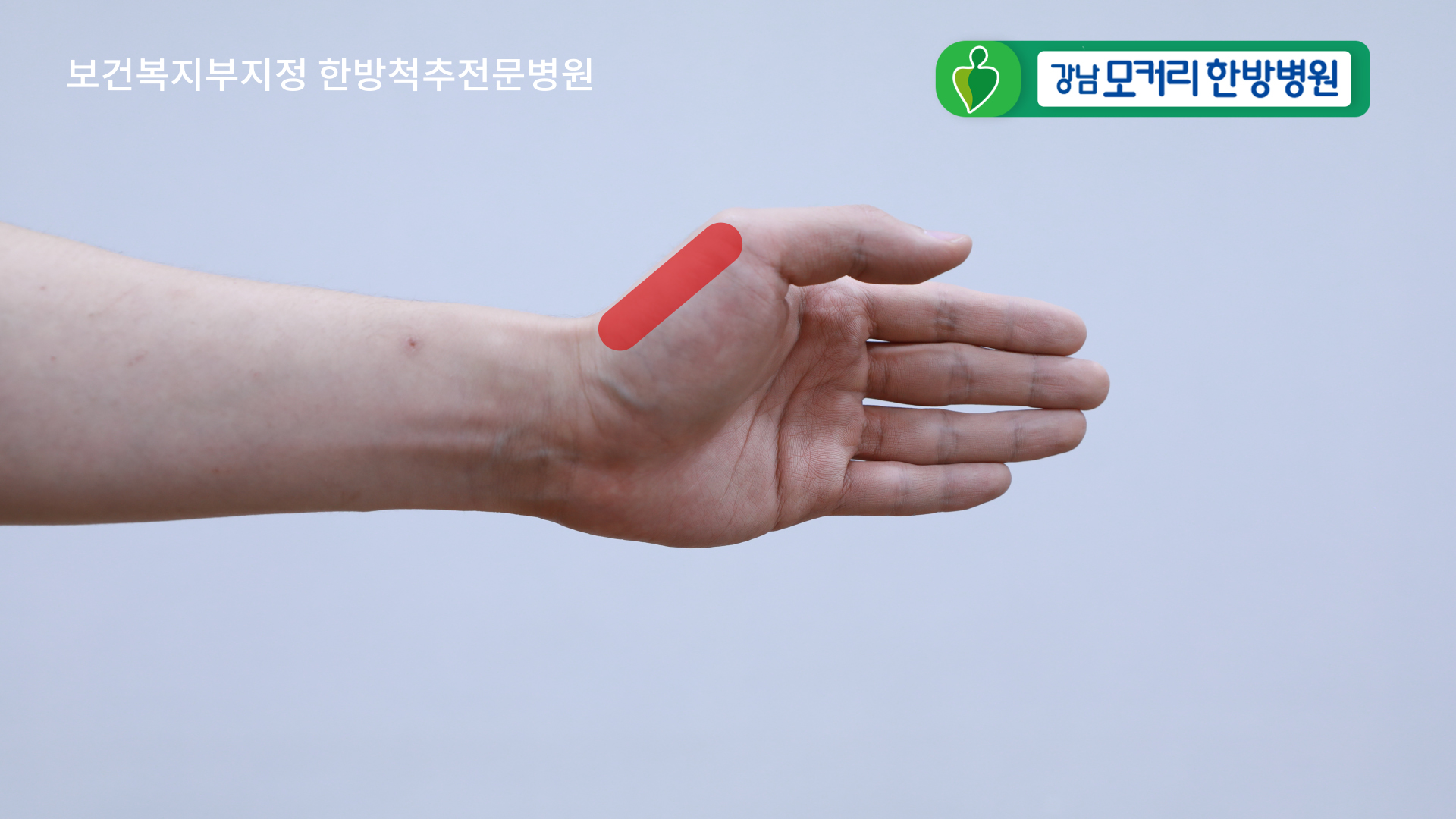 목 오른쪽이 아프다면 왼손의 엄지손가락 아랫 부분, 손의 이 부분을 아까 두판상근, 경판상근의 부위에 갖다 댑니다. 이 부분을 갖다 대는 이유는 이 부분이 손가락보다 훨씬 더 힘이 세기 때문입니다.