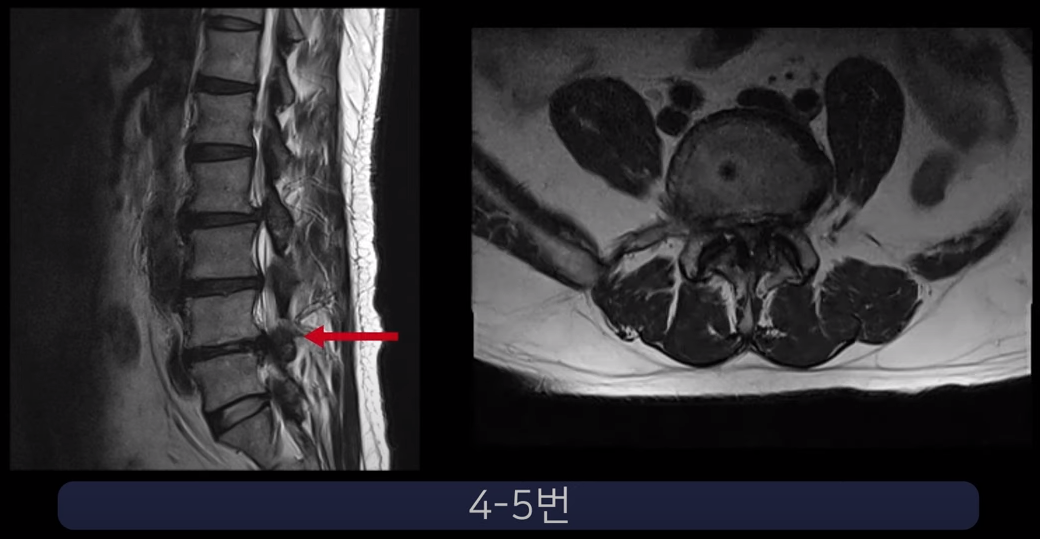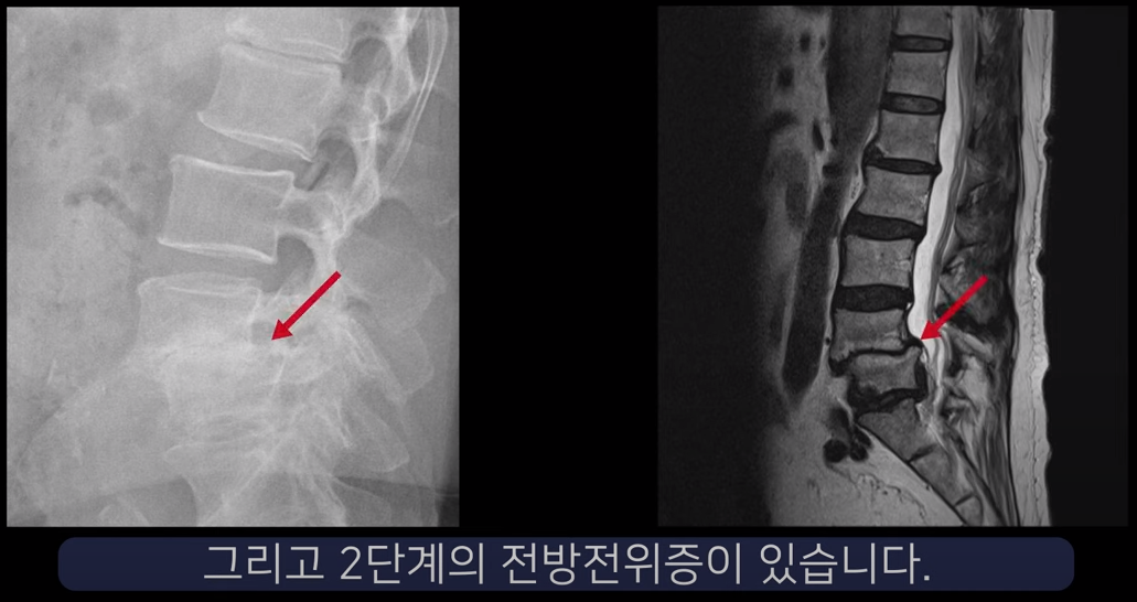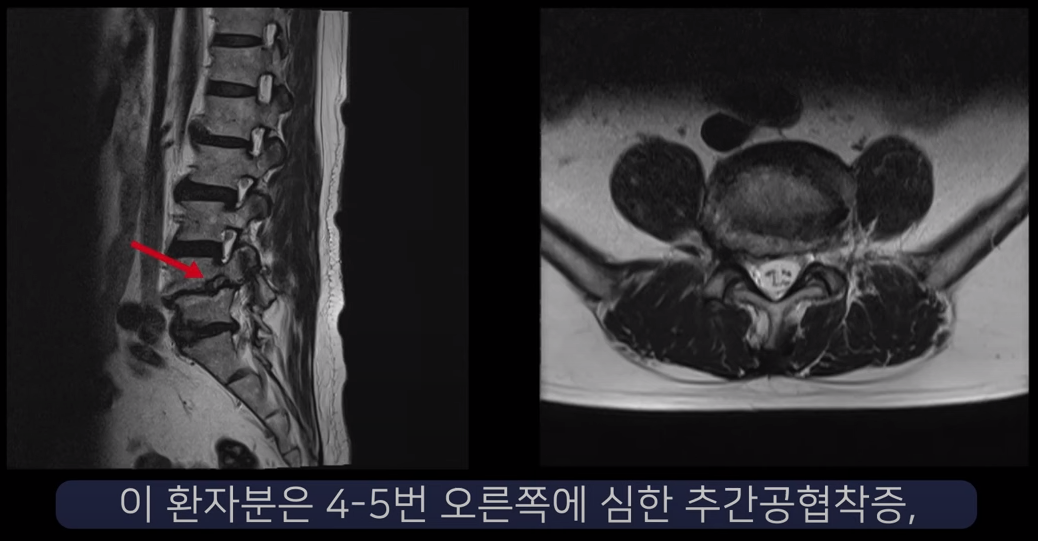 두 번째 환자분입니다. 이 환자분은 4-5번 오른쪽에 심한 추간공협착증, 그리고 2단계의 전방전위증이 있습니다.