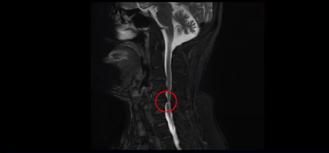 이 환자분은 목디스크 5번, 6번에 심한 디스크로 인해 경추척수증이 발생한 환자입니다. MRI에 보시는 것처럼 디스크가 심하게 밀려나와 이로 인해 척수신경이 눌려 신경손상이 하얗게 보입니다.