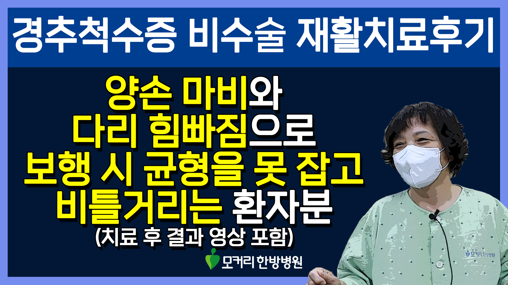 이 경추척수증 환자분, 양손 마비와 다리 힘빠짐으로 보행 시 균형을 못 잡고 비틀거리는 환자분의 재활치료 결과는 어떻게 되었을까요? 환자분의 재활치료 결과가 궁금하시다면 아래 썸네일을 클릭해 모커리한방병원 홈페이지에 로그인하신 후 치료 후 결과 영상을 꼭 보시길 바랍니다.