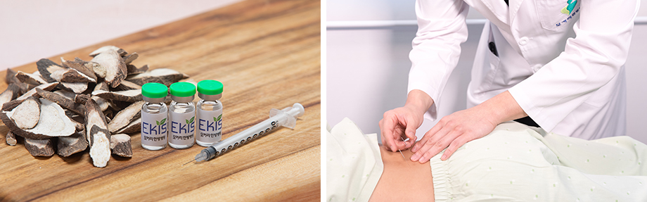 경직된 척추관절 주변의 근육과 인대에 침을 놓아 혈액순환을 개선시켜주어 통증을 감소시키며 퇴행으로 인하여 제 기능을 하지 못하는 근육과 인대를 유연하게 만들어줍니다. 약침치료의 경우 파골세포 분화 억제용 또는 연골세포 분화 촉진용 조성물(SG-Ⅱ)로 특허 받은 강척한약을 정제한 약침액을 통증 부위의 경혈에 직접 주입해 염증 및 통증 제거뿐만 아니라 목, 허리 주변 근육과 인대의 기능을 회복 및 강화시켜줍니다.