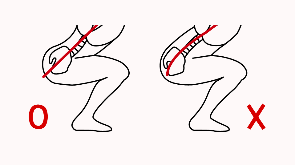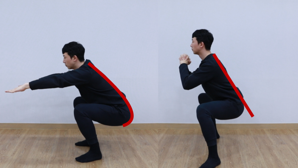 그 상태에서 일반 스쿼트를 할 때처럼 경추와 흉추, 요추가 구부러지지 않도록 유지하며 앉습니다.