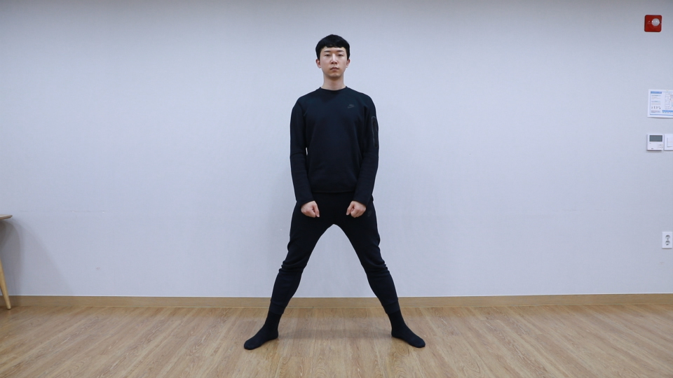 이때 발은 일자가 아닌 약 45도에서 60도 정도 바깥쪽으로 벌리고 섭니다.
