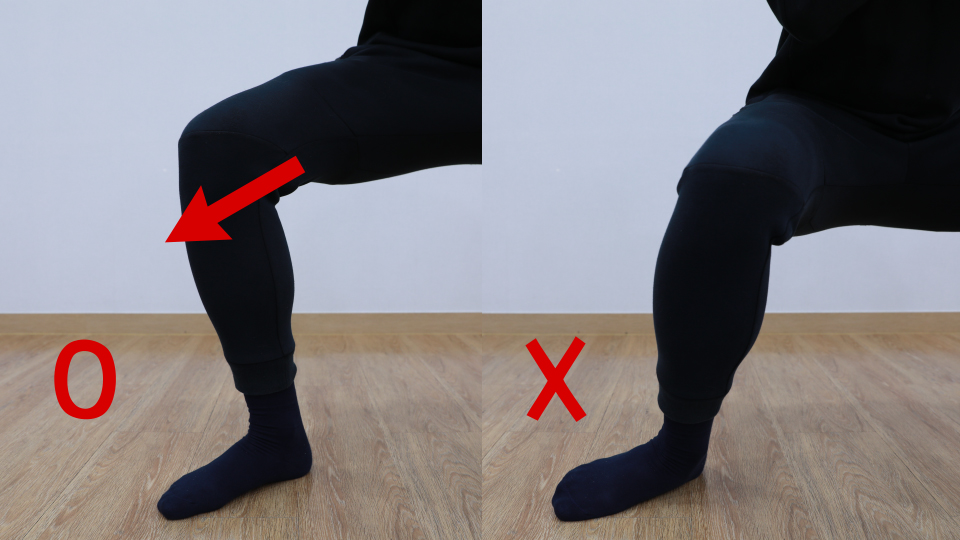와이드 스쿼트를 할 때 무릎은 발끝 방향으로 벌리면서 앉아줍니다.