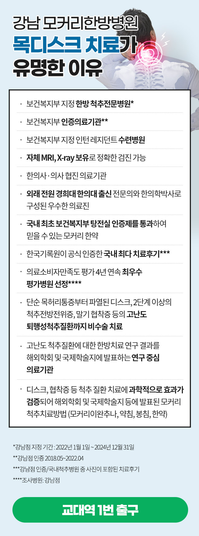 강남 모커리한방병원에서는 한 두 달의 치료 기간 내에 환자의 생활관리법이나 운동법을 자세하게 지도하여, 목디스크가 악화되지 않고 잘 회복될 수 있도록 돕습니다.