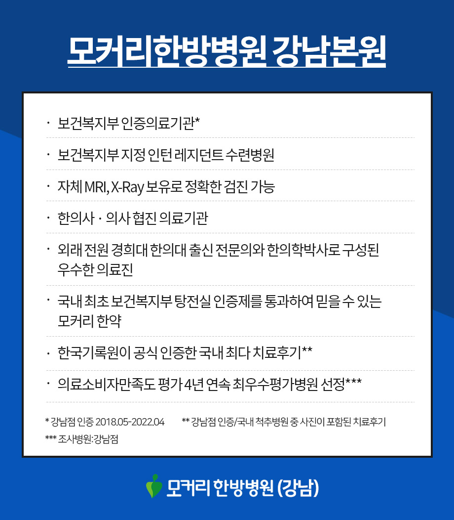 모커리한방병원의 치료후기는 대가성이 전혀 없으며, 어떤 내용도 수정되거나 삭제되지 않습니다.