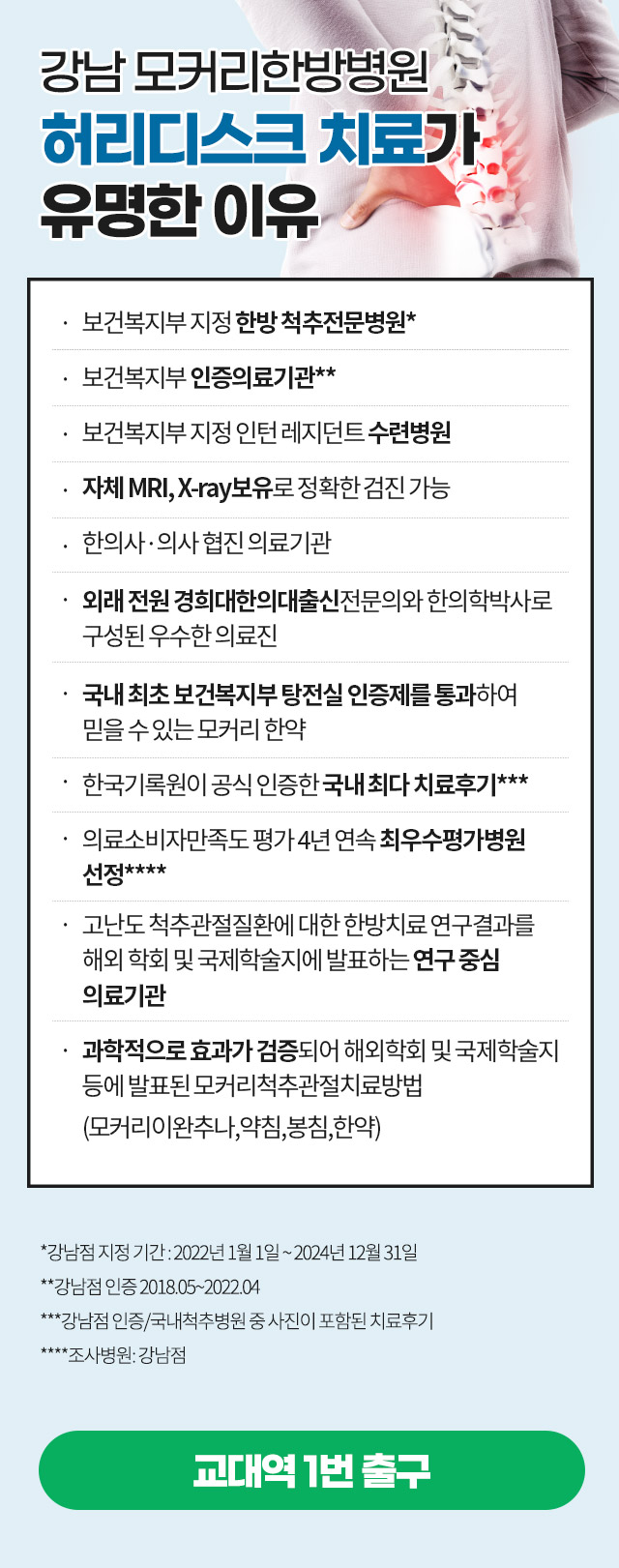 강남 모커리한방병원에서는 한 두 달의 치료 기간 내에 환자의 생활관리법이나 운동법을 자세하게 지도하여, 허리디스크가 악화되지 않고 잘 회복될 수 있도록 돕습니다.