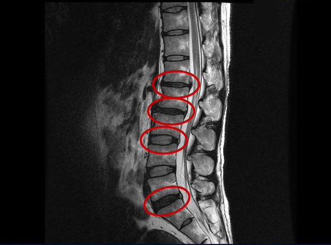 그런데 이 환자분의 MRI를 보면 여러 마디에 퇴행성디스크가 있습니다.