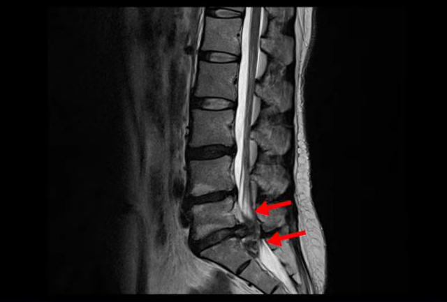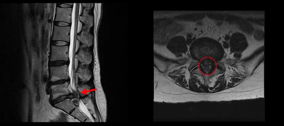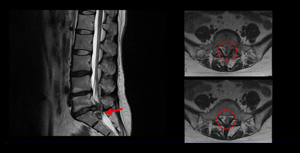 이 환자분의 허리 MRI를 보면 5번, 1번 디스크가 매우 심하게 터져 있는 것이 보입니다. 굉장히 심한 허리디스크터짐으로 인해 신경이 있어야 할 곳을 밀려나온 디스크 수핵이 거의 다 차지하고 있는 것을 볼 수 있습니다.