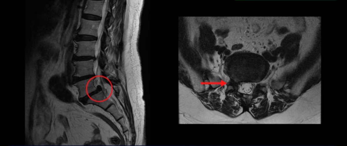 MRI를 보면 5번과 1번에 전방전위증과 척추분리증, 그리고 오른쪽으로 신경이 나가는 추간공을 막고 있는 디스크 탈출과 추간공협착증이 있습니다. 보시다시피 디스크와 뼈로 인해 신경이 나가는 구멍이 막혀 있습니다.
