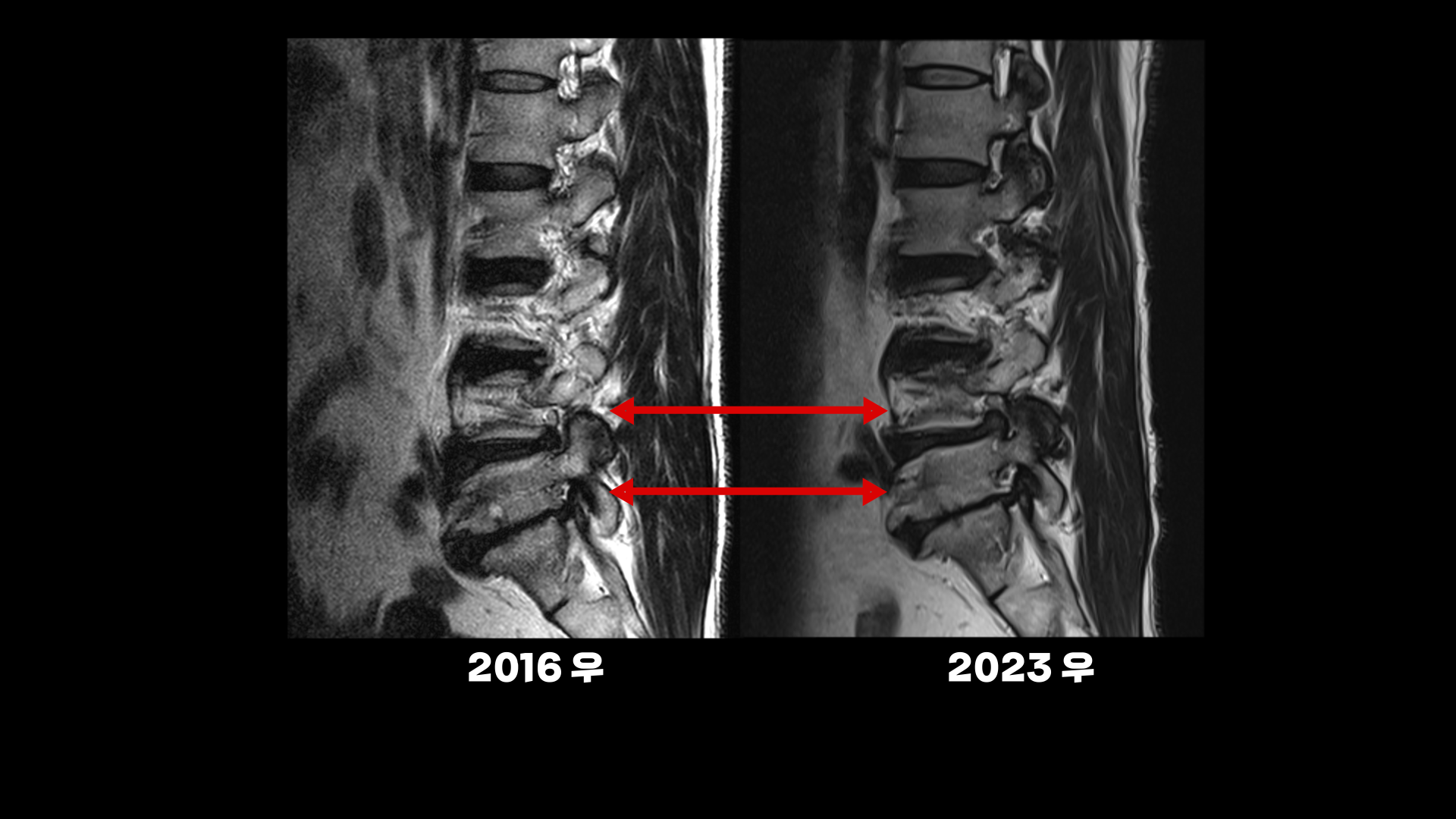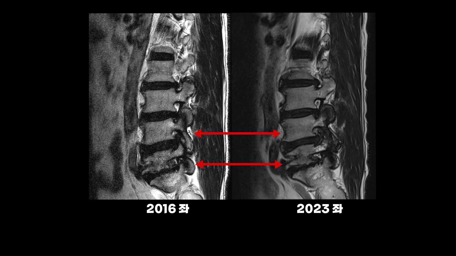 이분의 허리 MRI를 보면 2016년에 찍은 MRI와 2024년에 찍은 MRI가 있습니다.