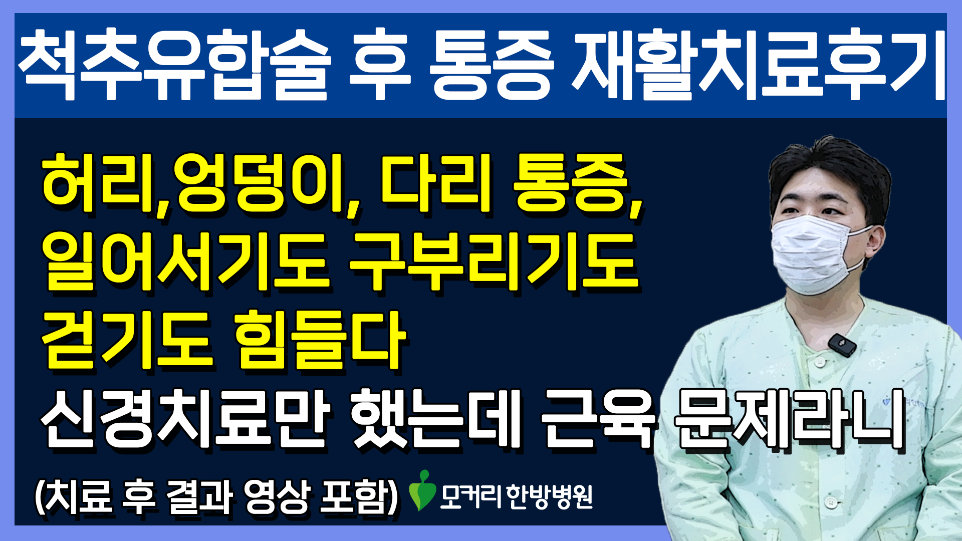 수술은 깨끗하게 잘 되었다는 얘기를 들었고 실제로 수술 후 2년간은 괜찮았습니다. 그러나 수술 후 2년이 지나면서 점점 허리, 엉덩이, 골반 부위가 뭉치면서 아파지고 계속 심해져서 결국 종아리와 발목까지 아프게 되었고 누웠다 일어나기도 힘들고 허리를 구부리는 것도 힘들고 오래 걷기도 어려워졌습니다. 대학병원에서는 약 처방 외에는 해줄 게 없다고 했고 다른 척추 병원들은 시술이나 주사치료를 하라고 해서 받았지만 효과는 제한적이었습니다.