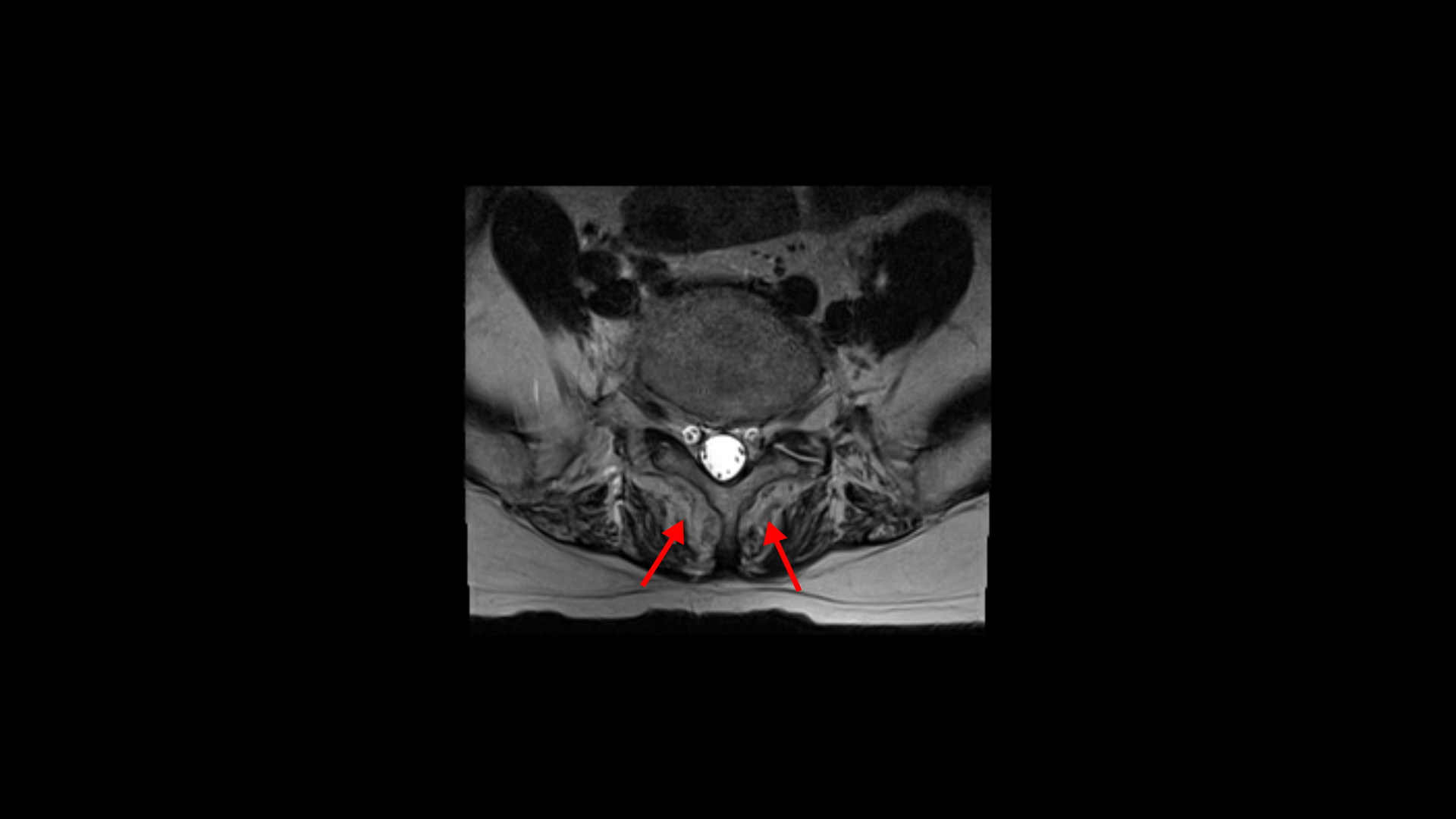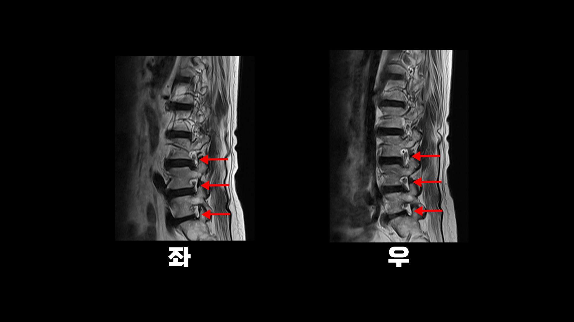 이 환자분의 일어서면 허리가 구부러지고 다리가 아파 걷기 어려운 이유는 근감소증 때문입니다. 특히 근육 중에서도 MRI에서 보면 허리 뒷부분에서 허리를 펴주는 근육인 기립근이 보시다시피 하얗게 지방으로 변해있습니다.