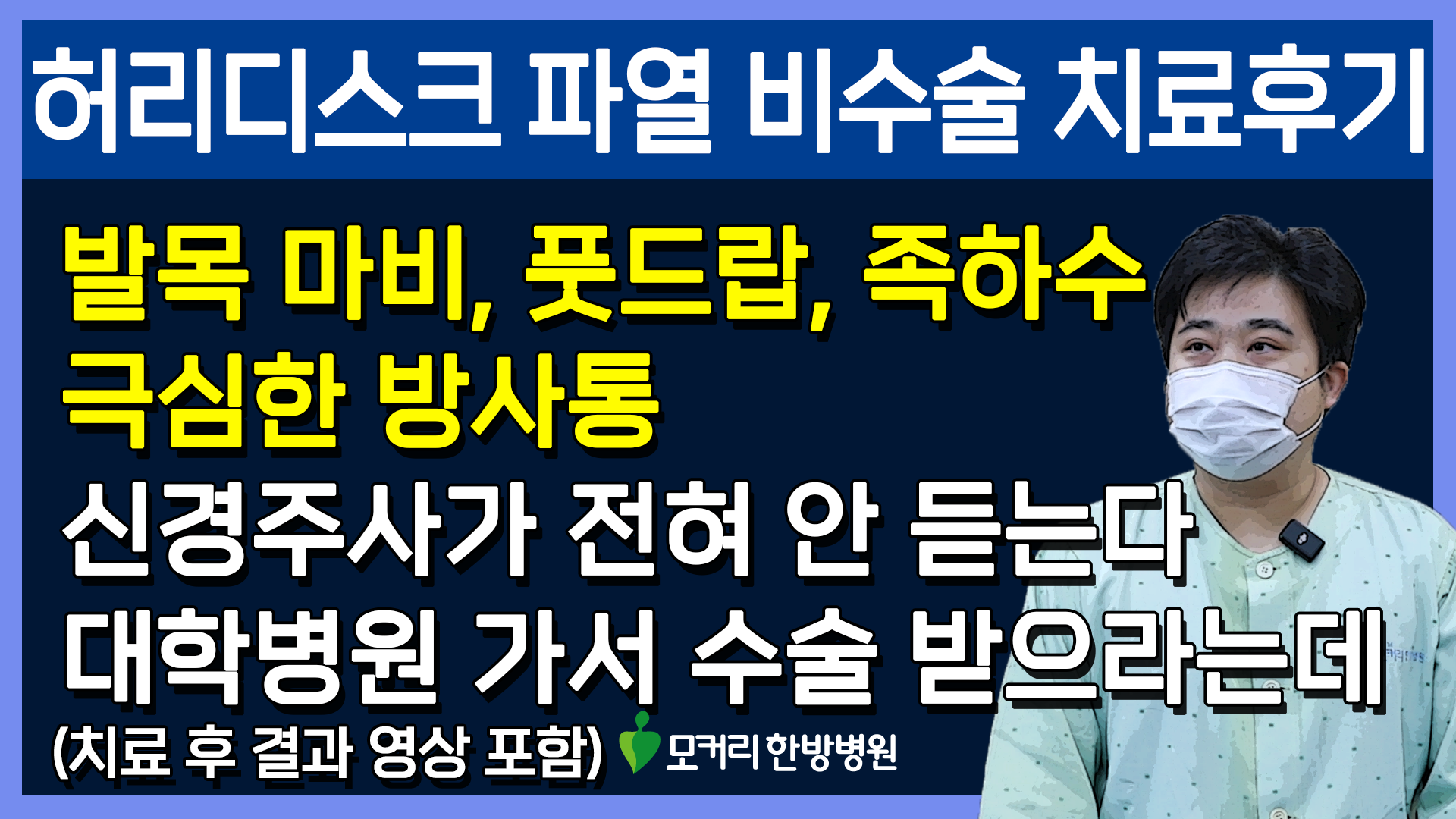 환자분의 근육 상태에 따라 마비가 풀리는 속도와 통증이 가라앉는 속도도 차이가 있는데요. 이 환자분은 근육 상태, 즉 근육량, 근력 등이 나쁘지 않은 상태였습니다. 이렇게 근력이 괜찮은 분들은 마비가 일주일에서 열흘 정도면 풀리고 통증이 사라지는 경우도 많은데요. 그럼 이 환자분도 열흘 정도의 짧은 기간에 마비가 풀리고 통증이 사라졌을까요? 이런 짧은 기간 안에 정말로 통증이 사라지고 마비가 풀린다면 수술 밖에 방법이 없다고 생각하는 환자분들은 이런 결과를 어떻게 받아들여야 할까요? 이 환자분의 치료 결과가 궁금하시다면 아래 영상을 꼭 보시길 바랍니다.