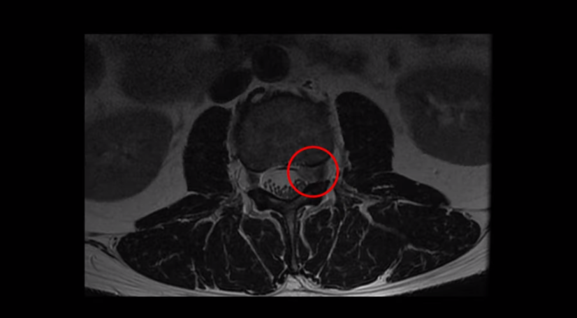 우선 이분 MRI를 보면 디스크가 심하게 터져 위로 밀려 올라가 있습니다. 신경가지가 나가는 구멍을 보시다시피 막고 있으니까 마비 증상과 방사통이 있습니다.