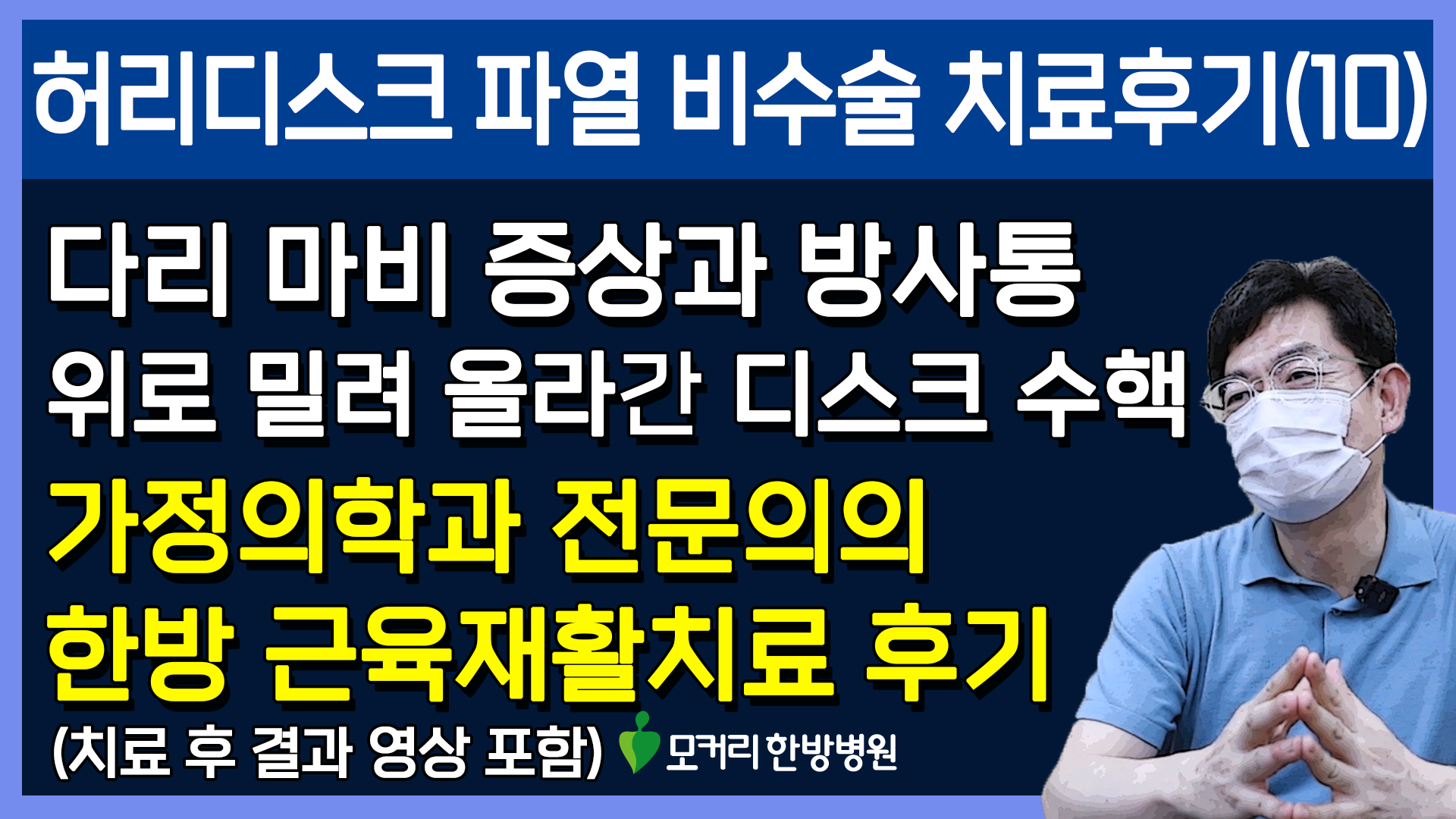 이 환자분은 가정의학과 전문의 선생님입니다. 디스크 파열 후 신경 주사 치료가 효과가 없자 대학병원에서 수술하자는 강력한 권유를 거절하고 저희 모커리에서 근육 재활치료를 받으셨습니다. 이분은 양방 의사 선생님인데 왜 한방병원에 와서 한방치료, 정확히 얘기하자면 한양방 협진 근육 재활치료를 받으셨을까요? 제가 먼저 간단히 설명해 드린 후 이분으로부터 왜 디스크 파열은 서둘러 수술하기보다는 우선적으로 비수술 치료를 먼저 제대로 받아야 하는지, 그리고 비수술 치료 중에서도 근육 치료가 왜 중요한지, 또 침, 추나요법, 도수치료 등은 어떻게 하면 도움이 되고 어떻게 하면 오히려 해가 되는지, 또 허리디스크 파열 치료에 왜 쉬는 게 정말 중요한 건지 마지막으로 비수술 치료에 왜 저희 모커리를 선택하신 건지 등에 대해 자세히 들어보도록 하겠습니다.