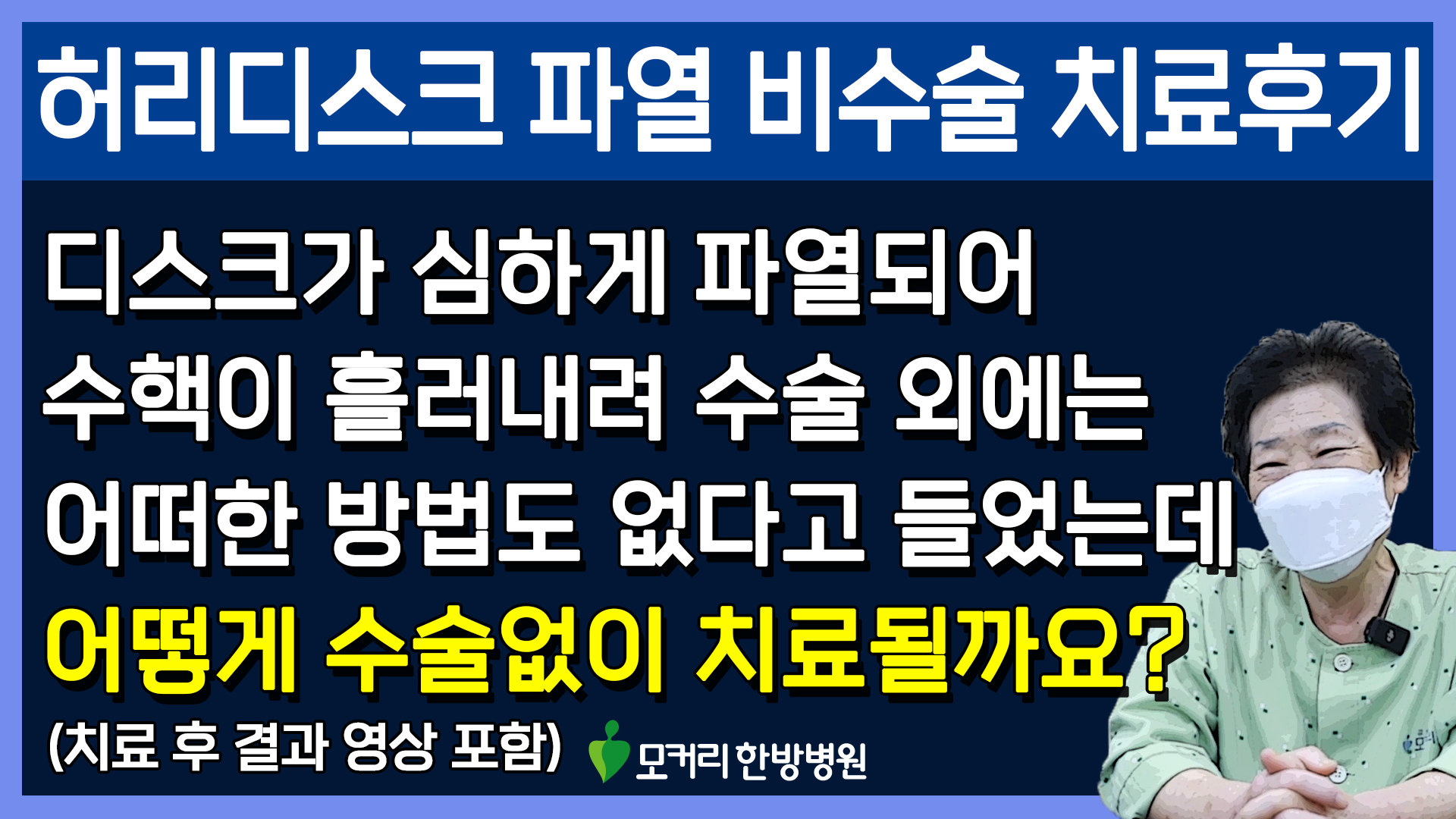 집에 와서 가만히 생각해 보니까 저는 수술이 겁나요. 마냥 수술을 해도 좋아진다는 보장도 없고 그래서 이건 내가 수술하면 안 되겠고 다른 방법도 찾아봐야지 하고 계속 인터넷을 뒤져봤어요. 그랬더니 모커리한방병원이 나오더라고요. 이제 그 치료후기들을 보고 병원 의료진 소개 이런 걸 보고 ‘여기라면 내가 치료받을 수 있겠구나’ 하고 왔어요.