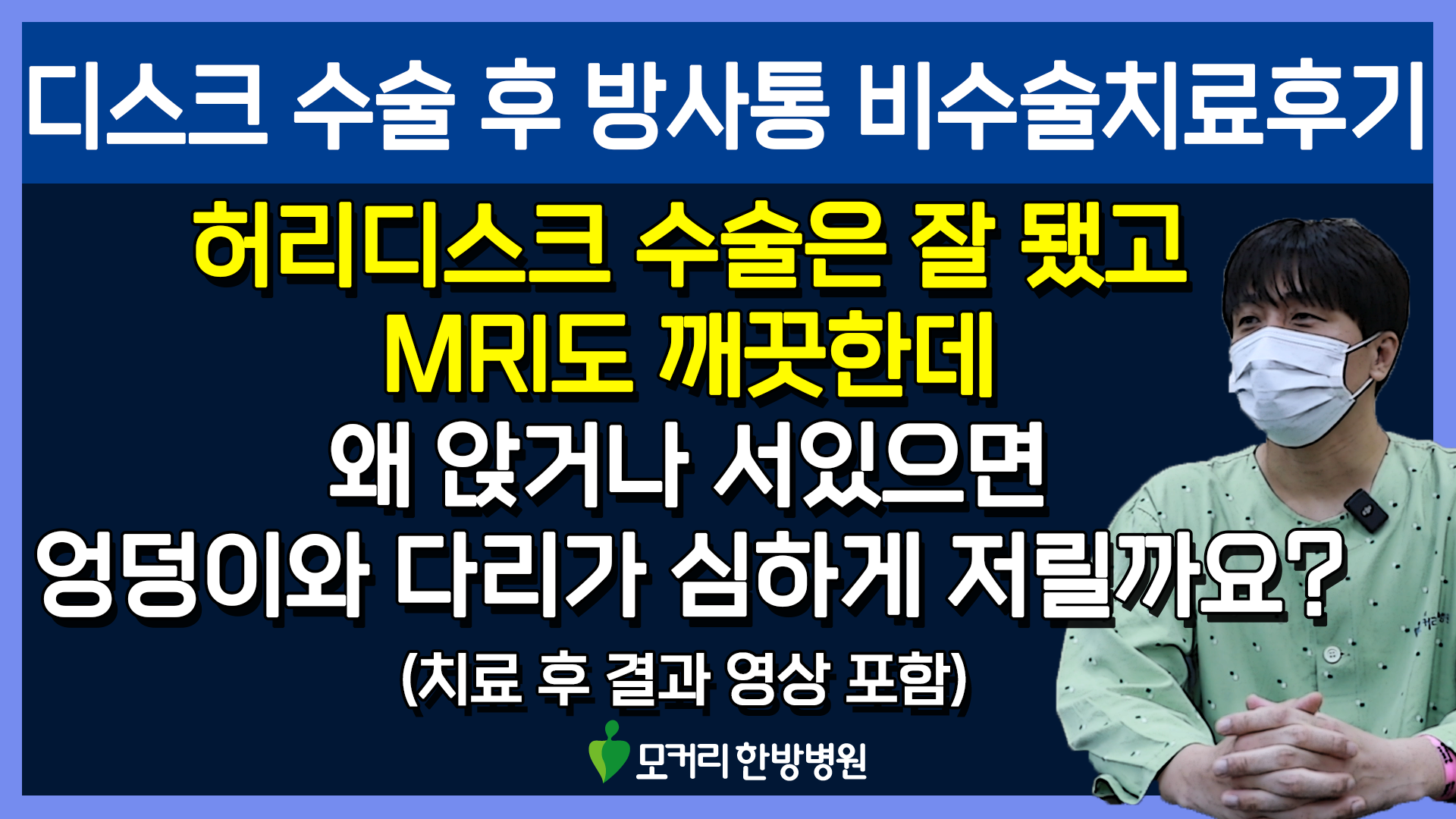 이렇게 재발했다 하고 갔는데 수술한 병원에서는 다른 처방 없이 그냥 ‘정상적인 거다, 통증이 조금씩 나올 수도 있다’ 그냥 ‘이게 어느 정도 통증이 발생하는 건 정상적인 거다’라고 하셨습니다. ‘시간이 한 1년 정도 지켜보면 괜찮아질 거다’ 이런 식으로 말씀을 그냥 하고 사후 처리가 아예 없었습니다. MRI도 그때 다시 찍어보았습니다. 근데 MRI상에서는 특별하게 이 사람이 이렇게 통증을 느낄만한 그런 상황이 아니다. 병원에서도 그래서 자꾸 할 수 있는 거는 그냥 신경주사 그 정도 처방 밖에 없었습니다.