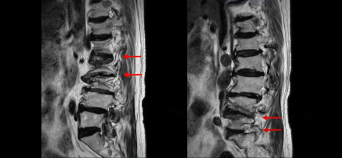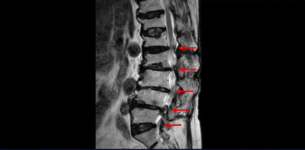 이 환자분은 허리 여러 마디가 다 안 좋아서 오랫동안 허리가 아프셨고 허리도 일찌감치 굽으셨습니다. MRI를 보시면 허리 여러 마디가 심하게 안 좋습니다.