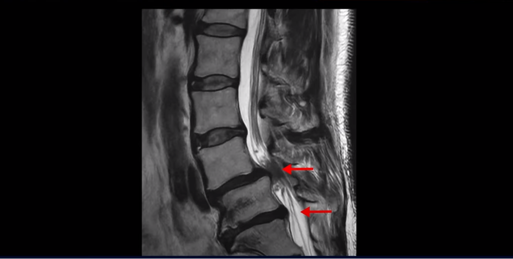 제가 먼저 이 환자분 MRI를 보면서 설명 드린 후 이분 말씀 더 들어보겠습니다. 보시다시피 두 마디가 심하게 퇴행되어 있고