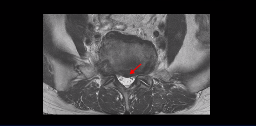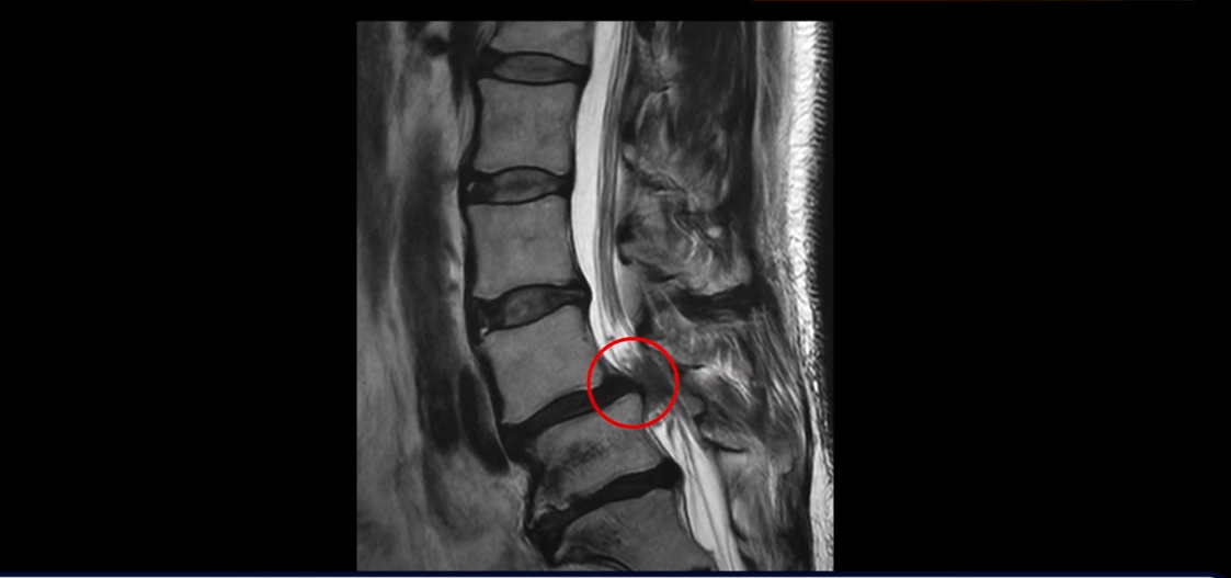 이건 아주 오래된 퇴행성디스크로 보입니다. 그래서 이 환자분은 양쪽 엉덩이와 다리가 모두 저리고 아픈 게 양쪽 추간공 문제 때문일 수도 있고 중심성 협착 때문일 수도 있습니다. 퇴행성디스크 때문에 아플 가능성은 상대적으로 적어보입니다.