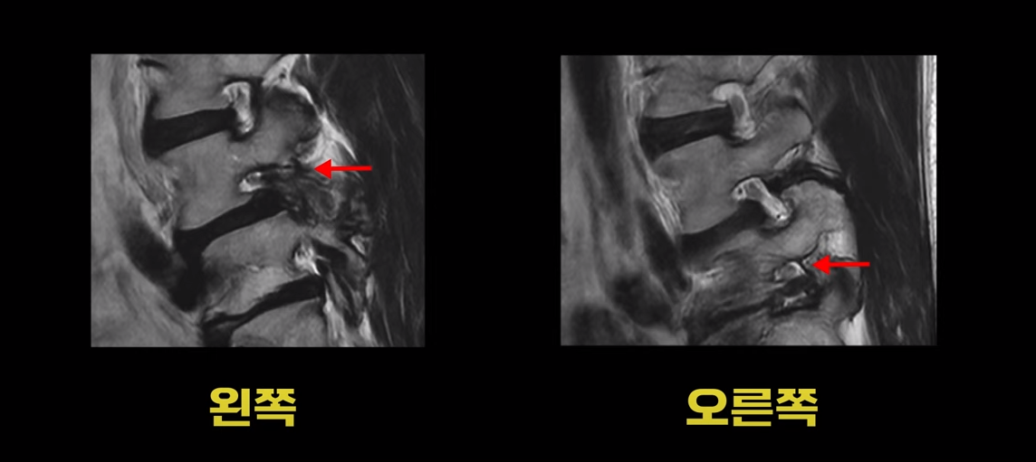 양쪽 신경 가지가 빠져 나가는 추간공도 왼쪽 오른쪽 모두 좁아져 있습니다.