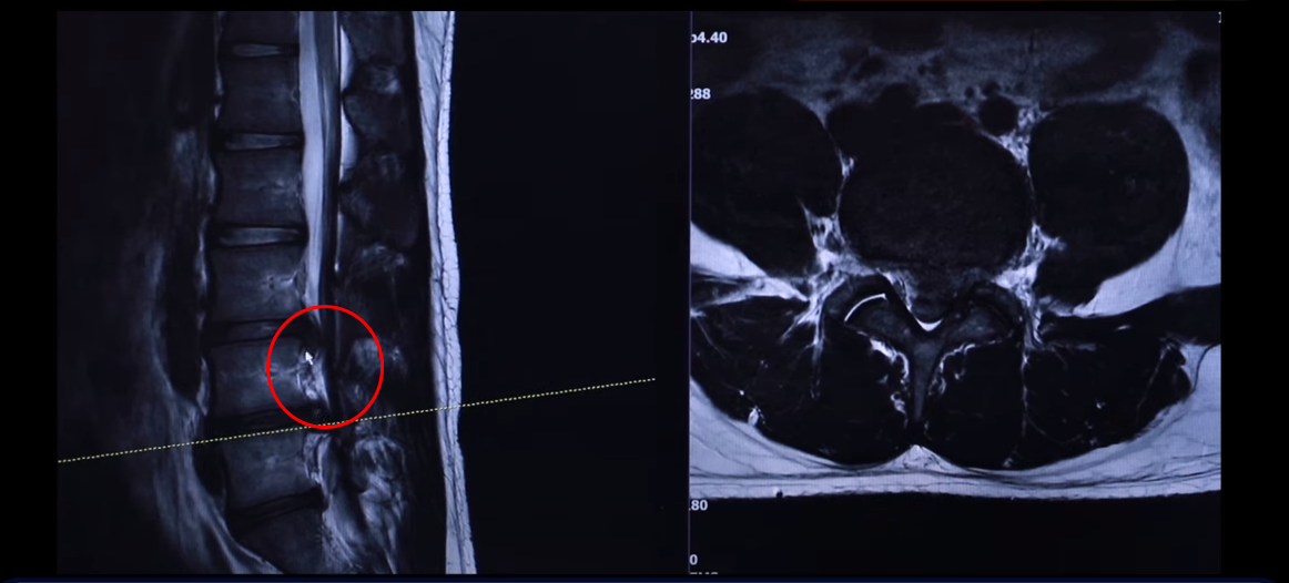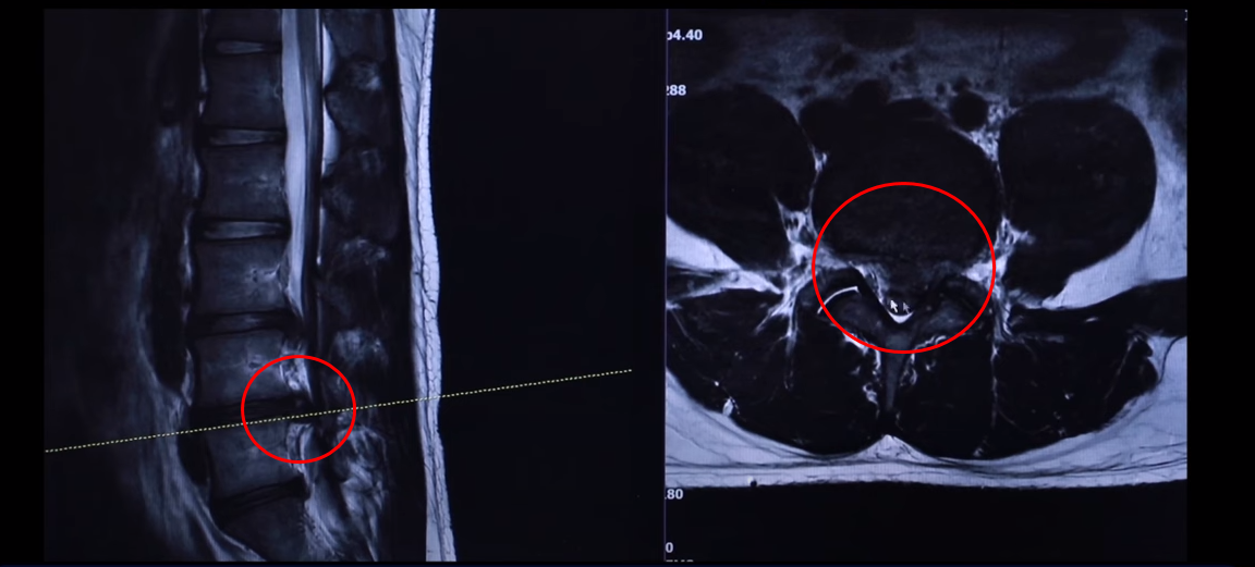 왼쪽 다리에 참을 수 없을 정도로 심한 방사통이 생긴 겁니다. 이분이 디스크가 왜 터졌냐? 24살이신데 어릴 때부터 허리가 아팠습니다. 고등학교 때부터 오랫동안 허리가 아팠기 때문에 나이에 맞지 않게 세 마디가 벌써 퇴행돼 있죠. 군대 때도 아팠고 최근에 중량 스쿼트, 웨이트 트레이닝 하다가 디스크가 터지게 됩니다. 웨이트 트레이닝 하다가 다리가 이상한 걸 느껴서 병원에 가서 MRI를 찍어 보니까 이렇게 심하게 터져 있습니다. 보통 이렇게 심하게 터져 있으면 어느 병원을 가든 정형외과나 신경외과에서 수술을 해야 된다 이런 얘기를 들을 가능성이 있습니다.