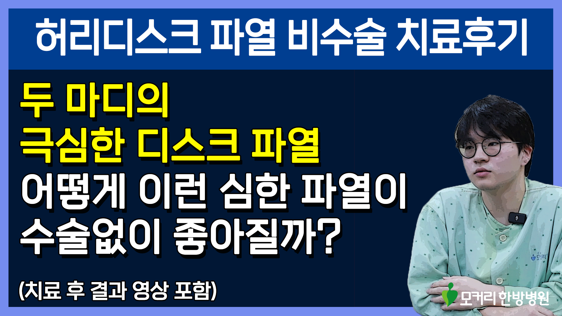 치료가 잘 될 거라고 처음에는 믿지 않았어요. 내가 봐도 이게 수술 없이 치료가 될 만한 게 아닌데 의심도 많이 가는 거예요. 저도 반신반의 하면서 왔죠. 저희 형이 그러더라고요. 미안하지만 거기서는 치료가 안 될 것 같다 그러더라고요. 그렇게 의심을 했어요.